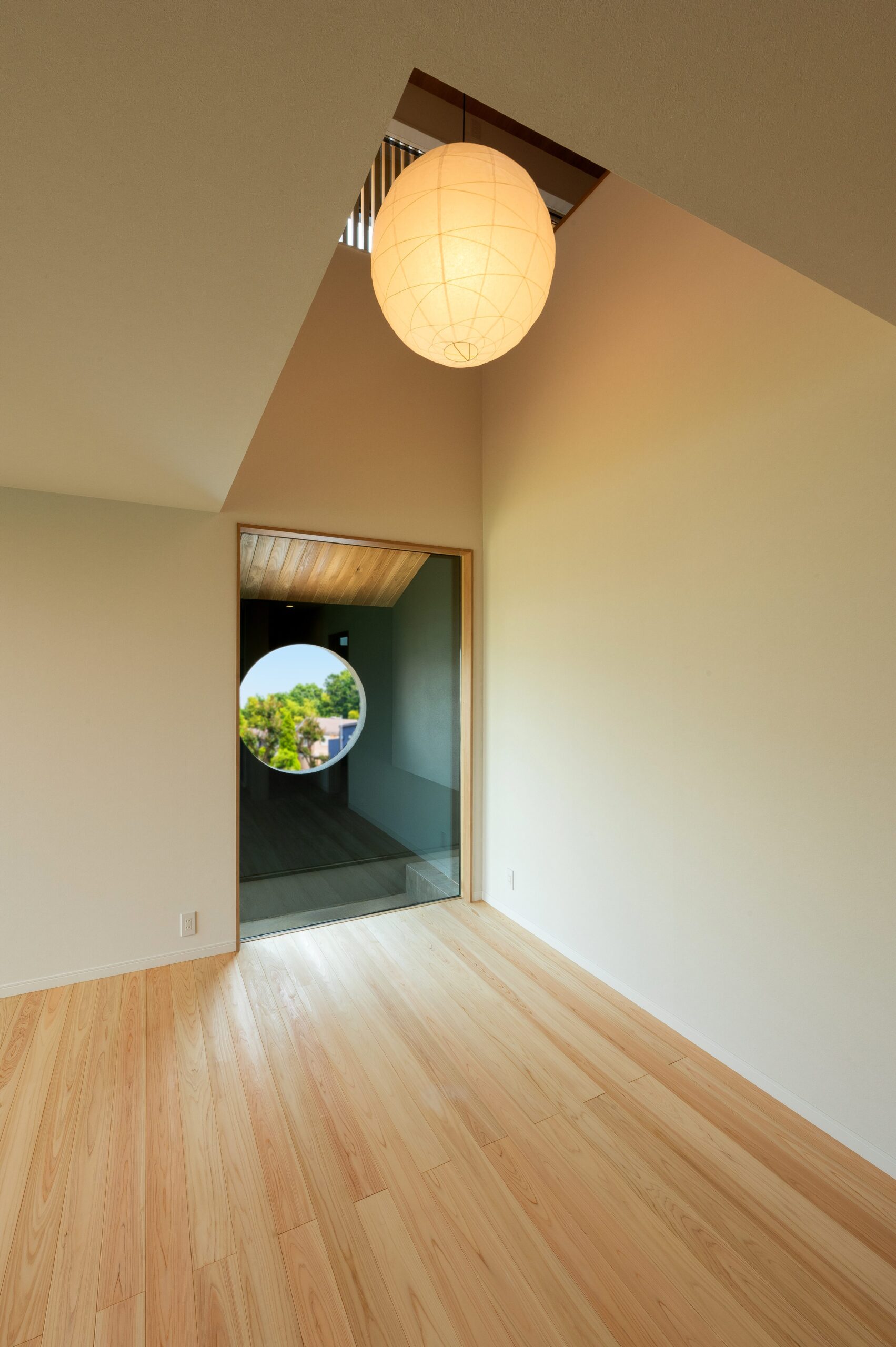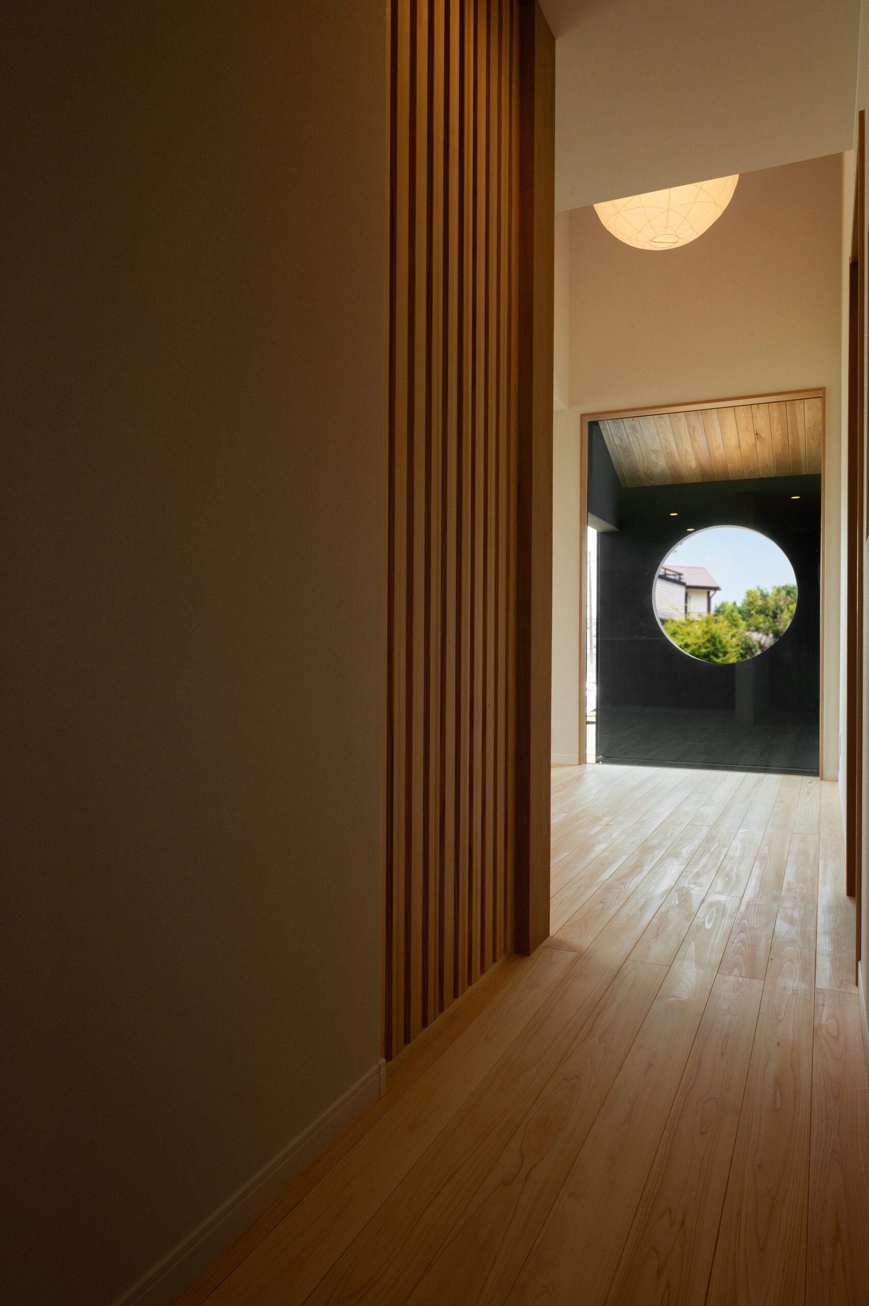 玄関を開けると、すっきりと整えられた空間が広がります。ここでも丸窓は重要なアクセント。廊下の先に光の輪として現れ、奥へと続く道をドラマチックに演出します。室内から眺める丸窓からは、まるで額縁に収められた絵画のように、外の景色を季節ごとに楽しむことができます。