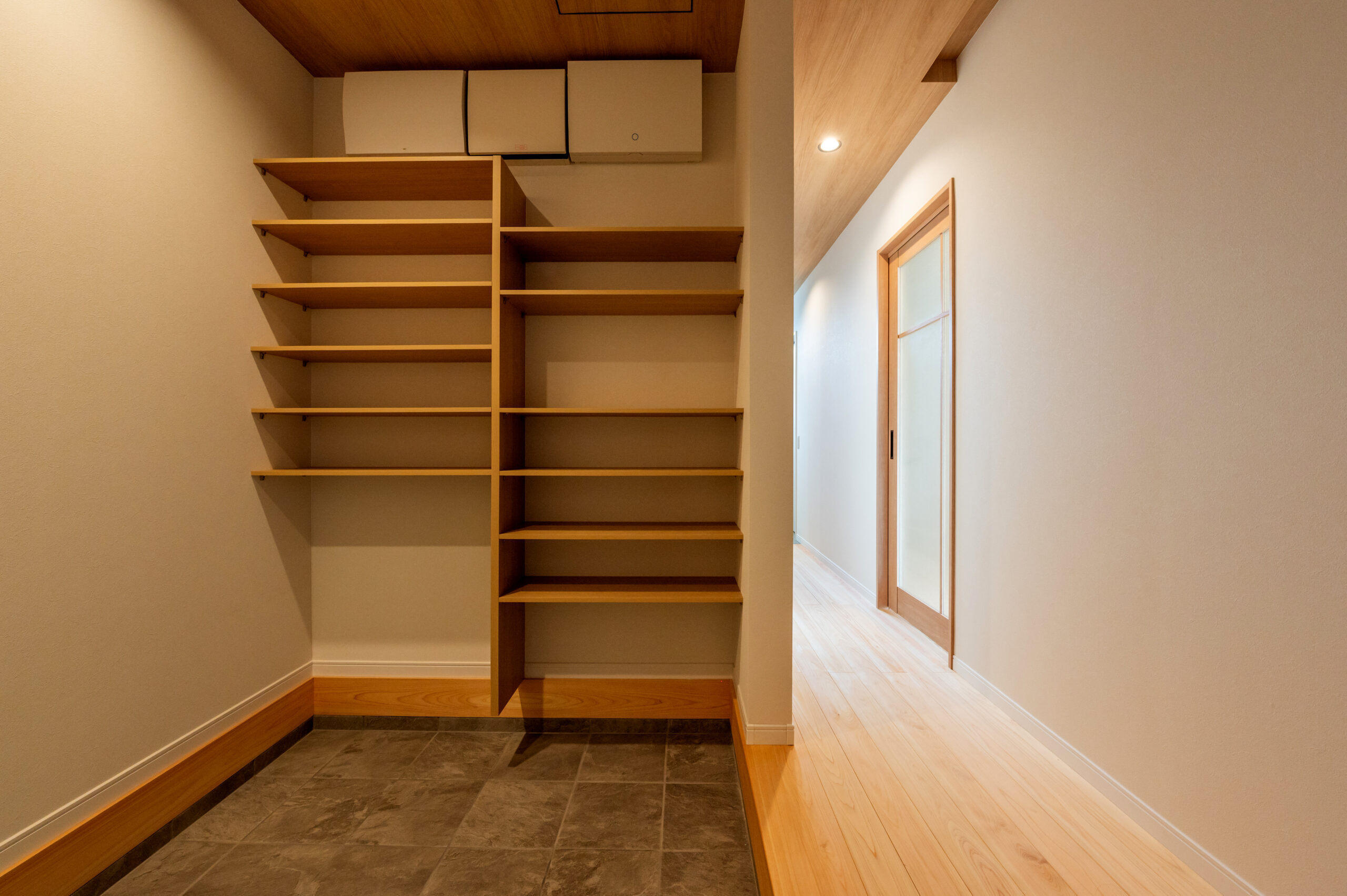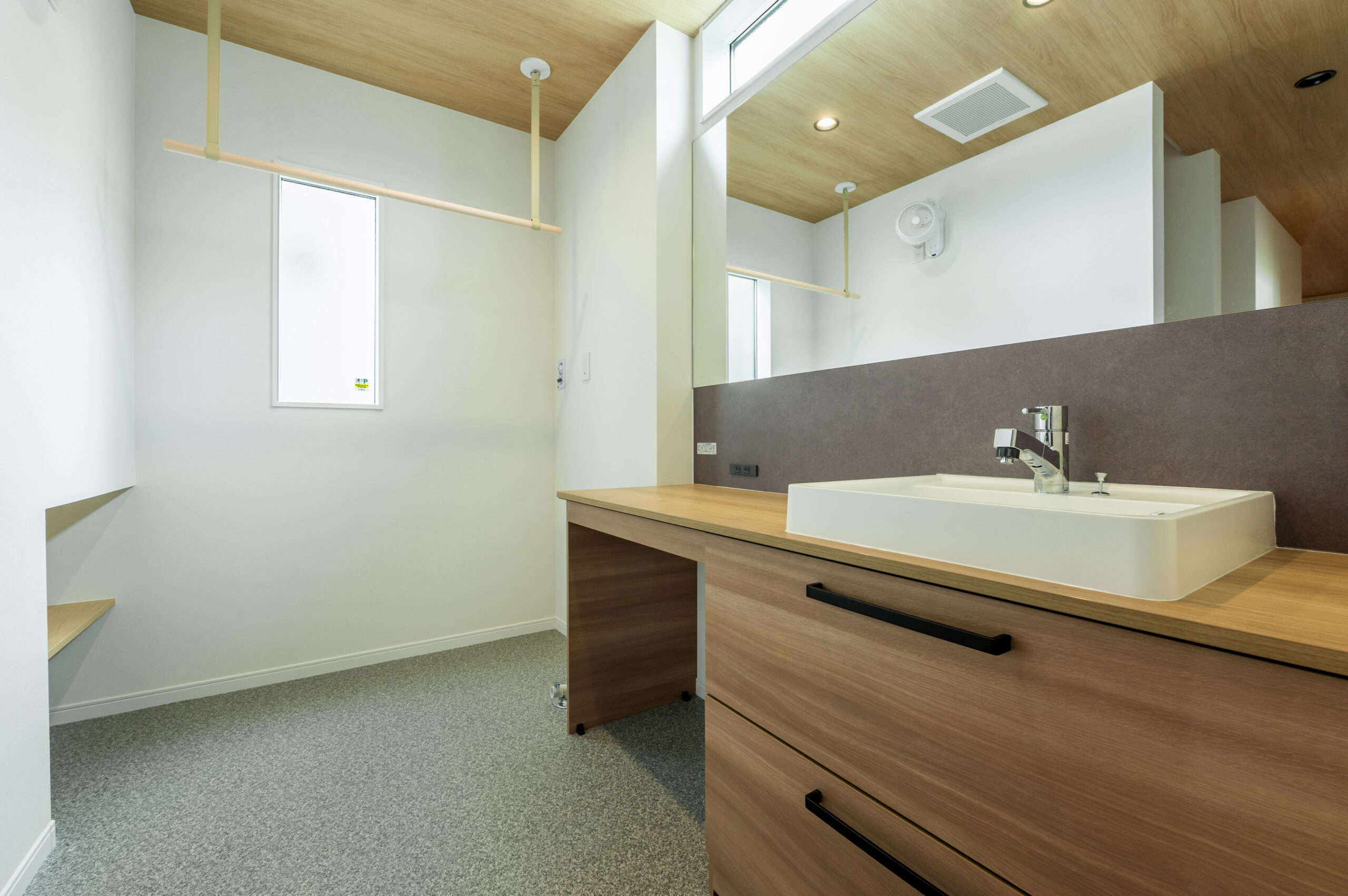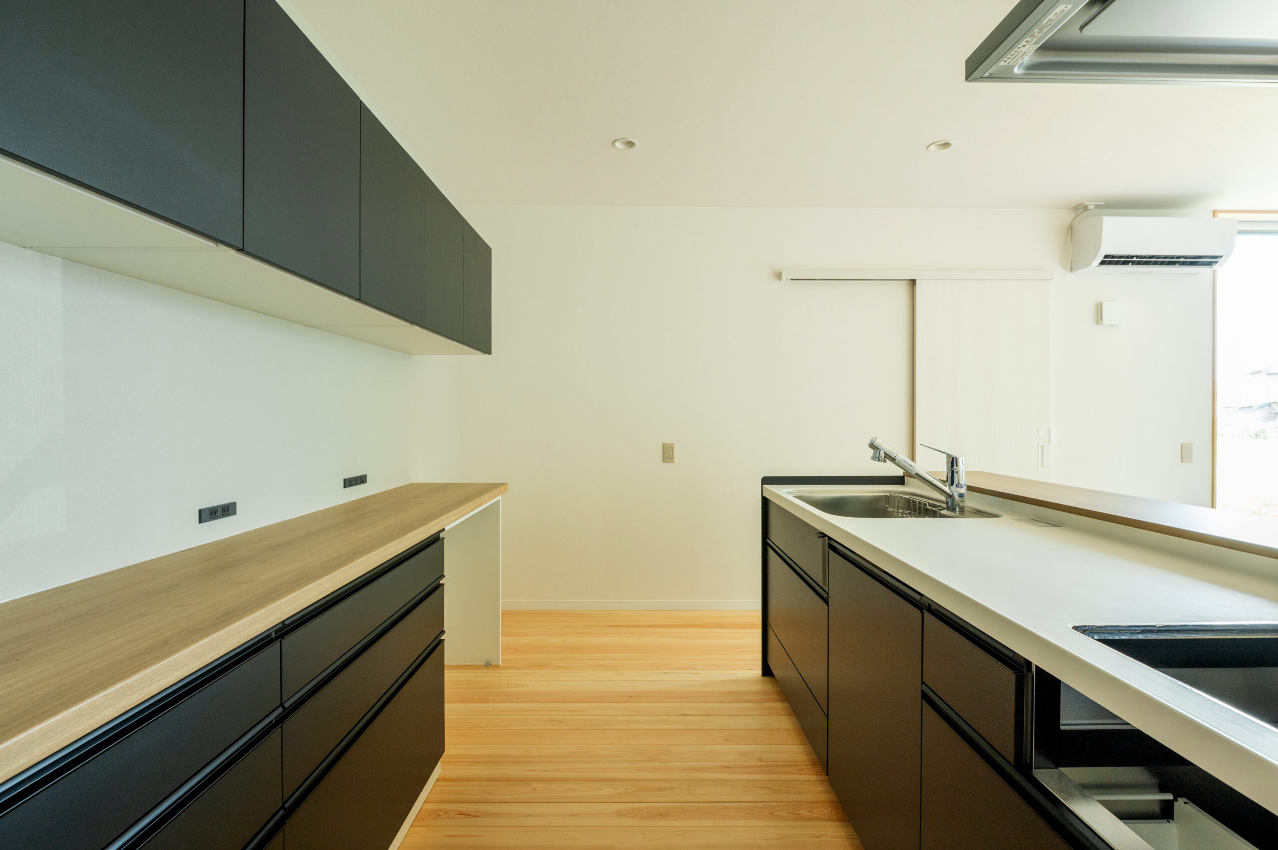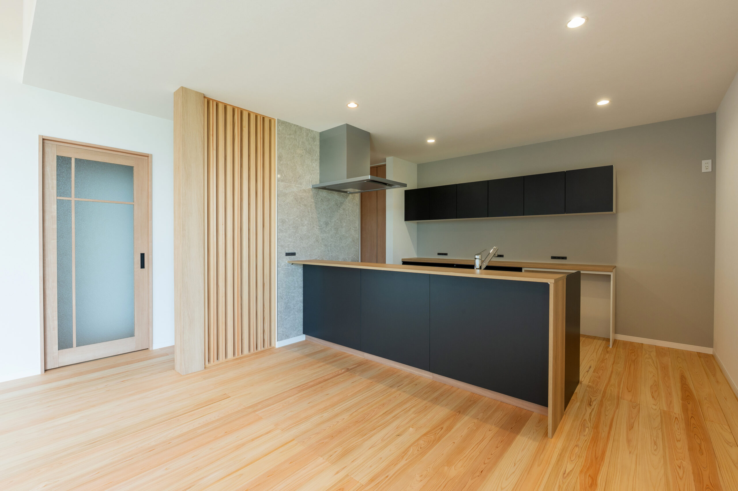 LDKは、木目が美しいフローリングとシンプルな内装で統一され、広々とした開放感が特徴です。キッチンは機能性を重視しつつ、空間に馴染むデザインに。随所に設けられた造作収納は、空間を有効活用し、生活感を隠しながらも使い勝手の良い住まいを実現しました。