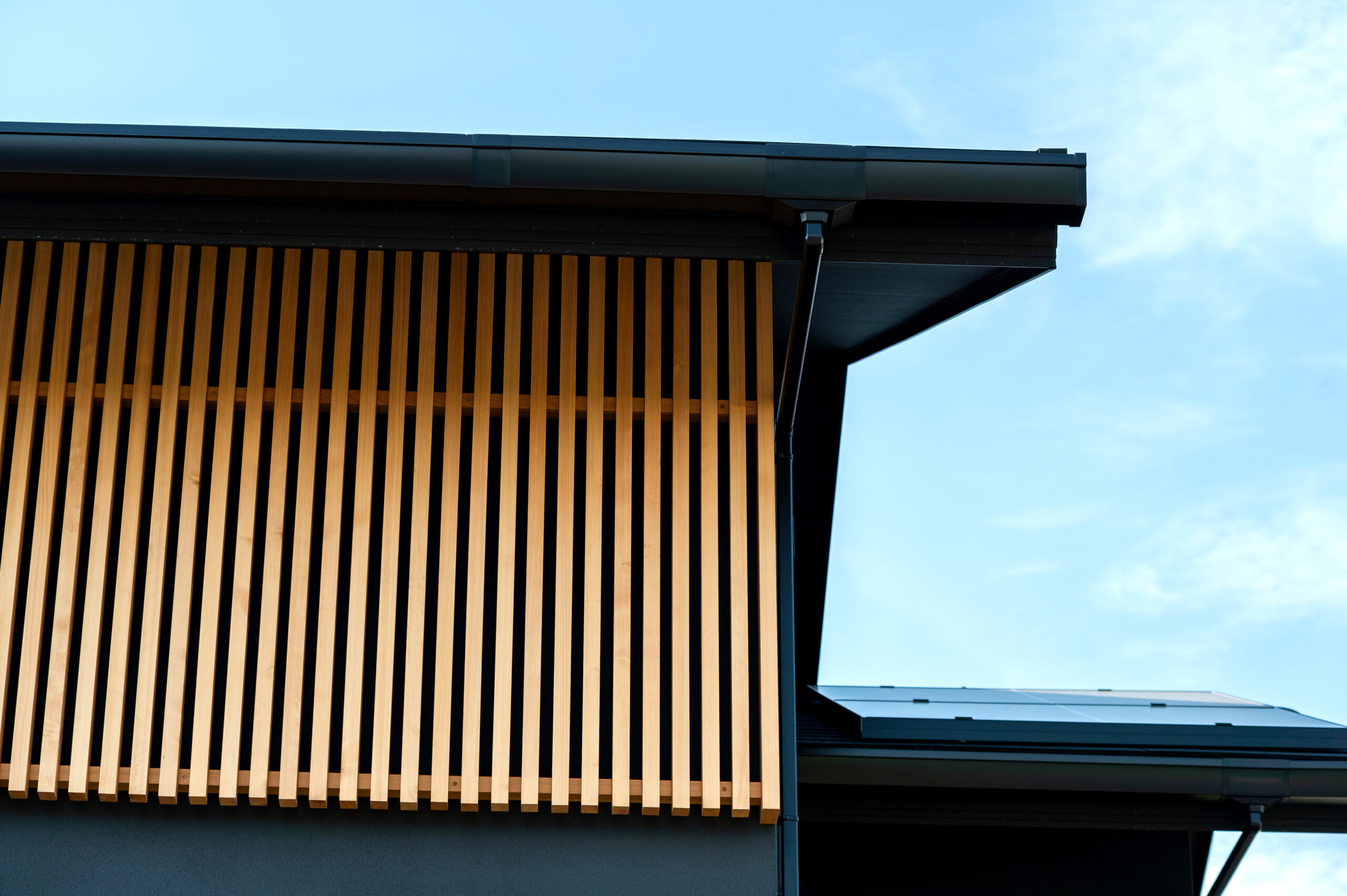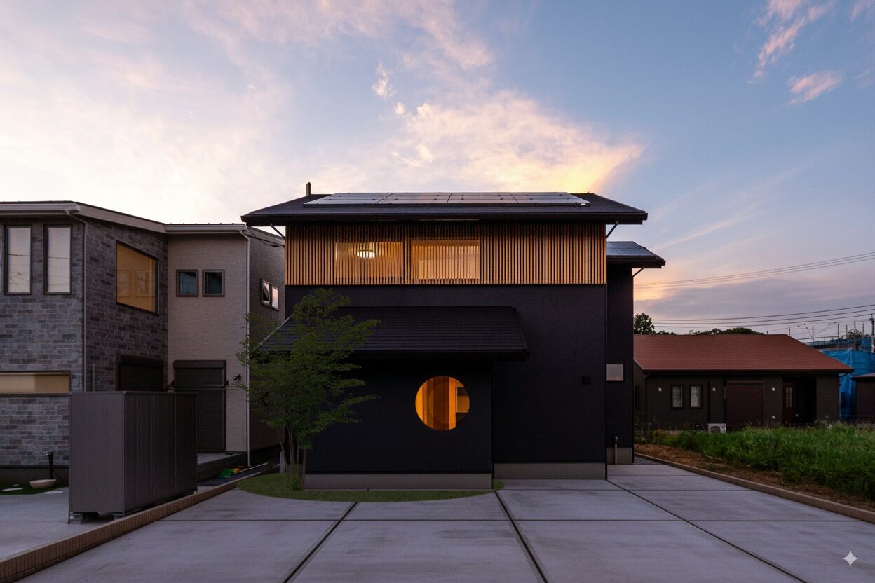 外観は、落ち着いた色合いの木材と漆喰壁の組み合わせが、周囲の街並みに溶け込みながらも洗練された存在感を放ちます。正面に配された大きな丸窓は、この家の象徴的なデザインです。