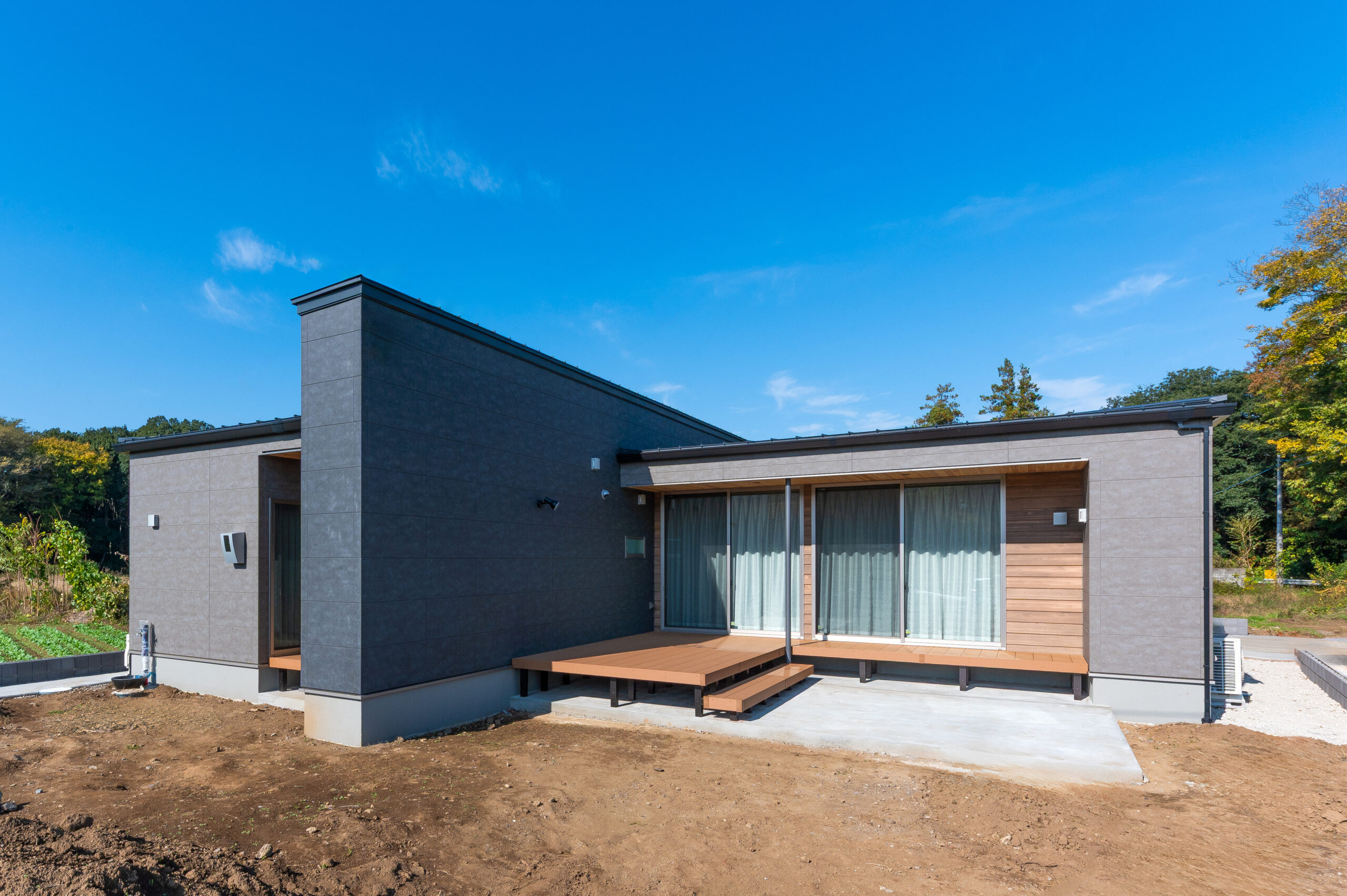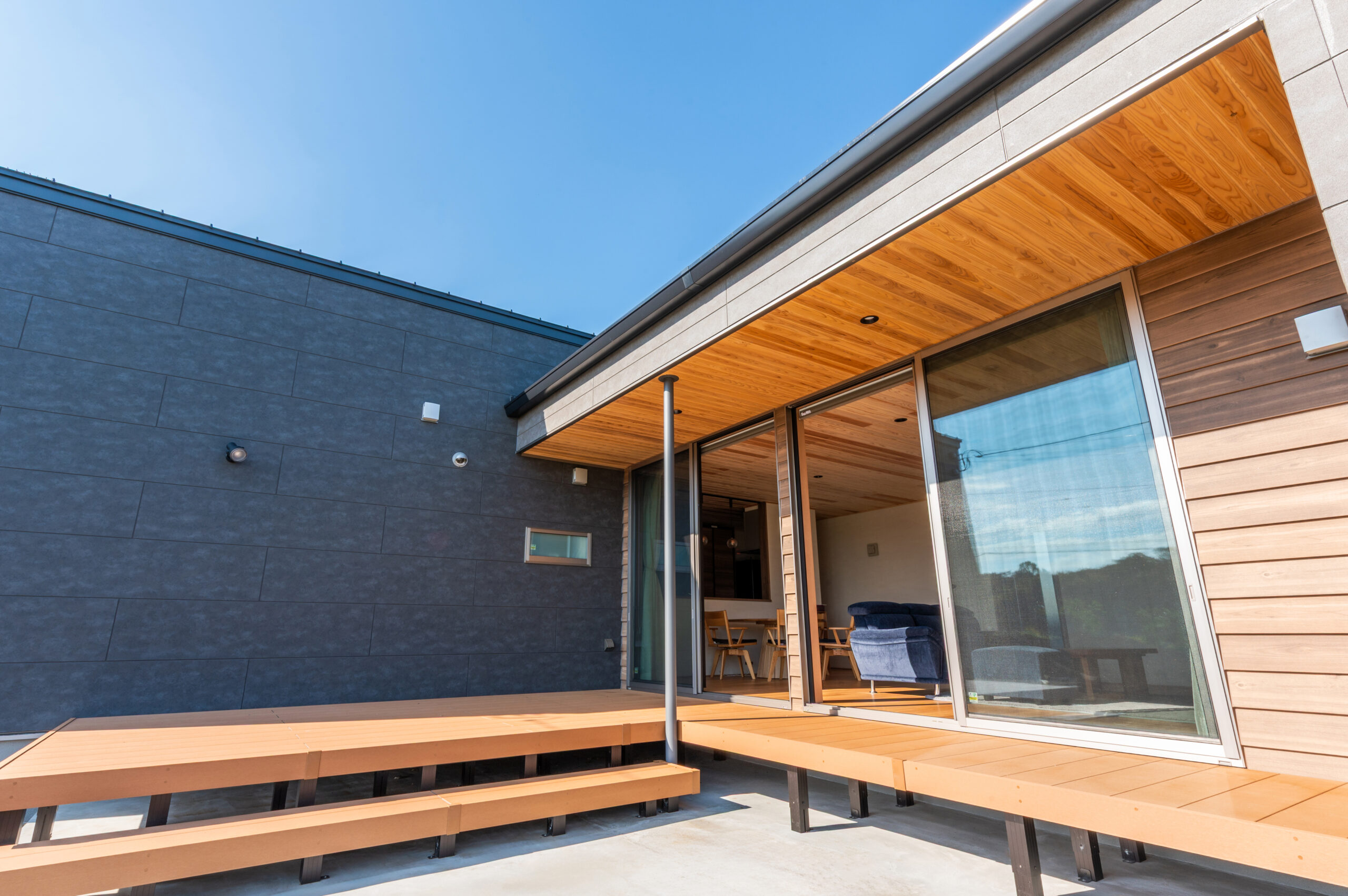 外観は黒い外壁に木の軒天を組み合わせたモダンデザイン。平屋ならではの水平ラインが美しく、重厚感とナチュラルさが共存する佇まいに仕上がりました。軒下にはベンチスペースもあり、家族で外の風を感じながら過ごす憩いの場所として利用できます。