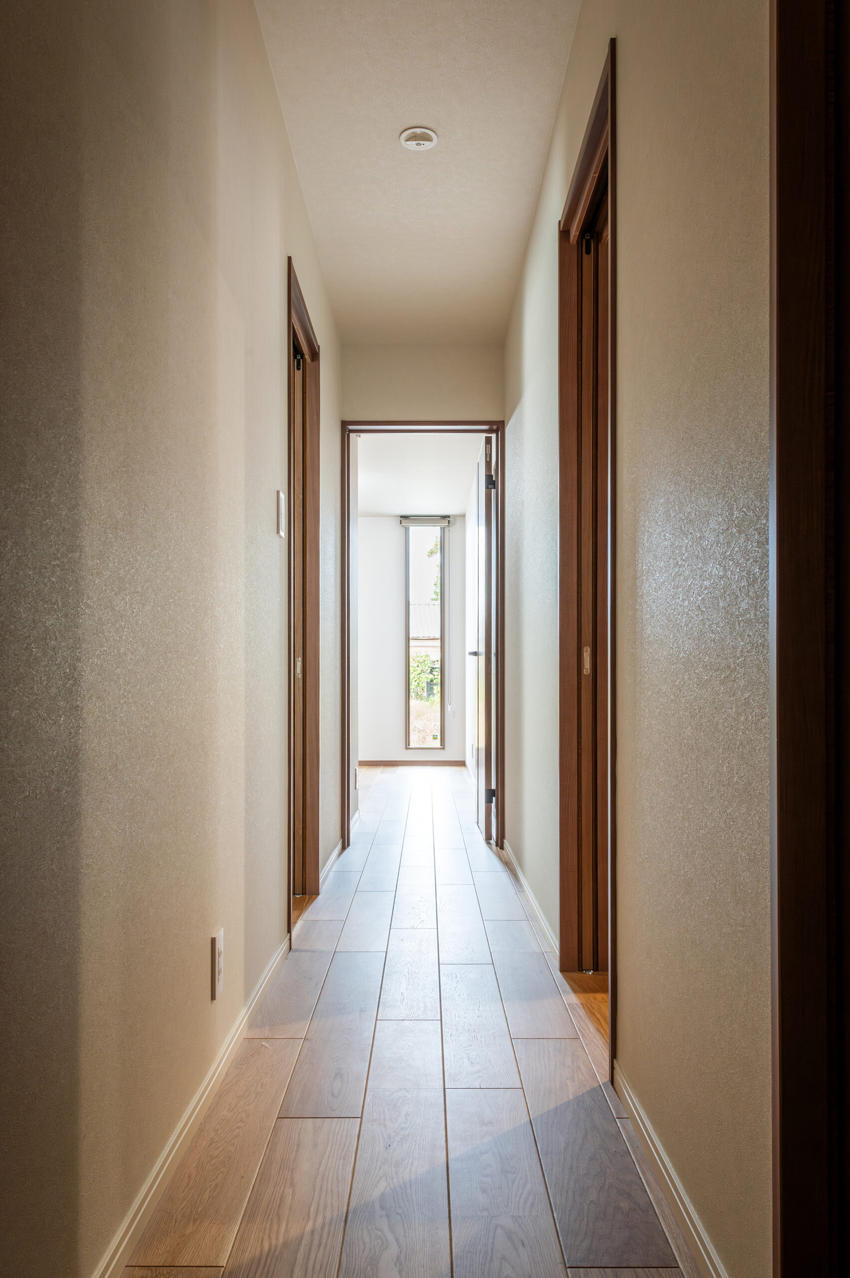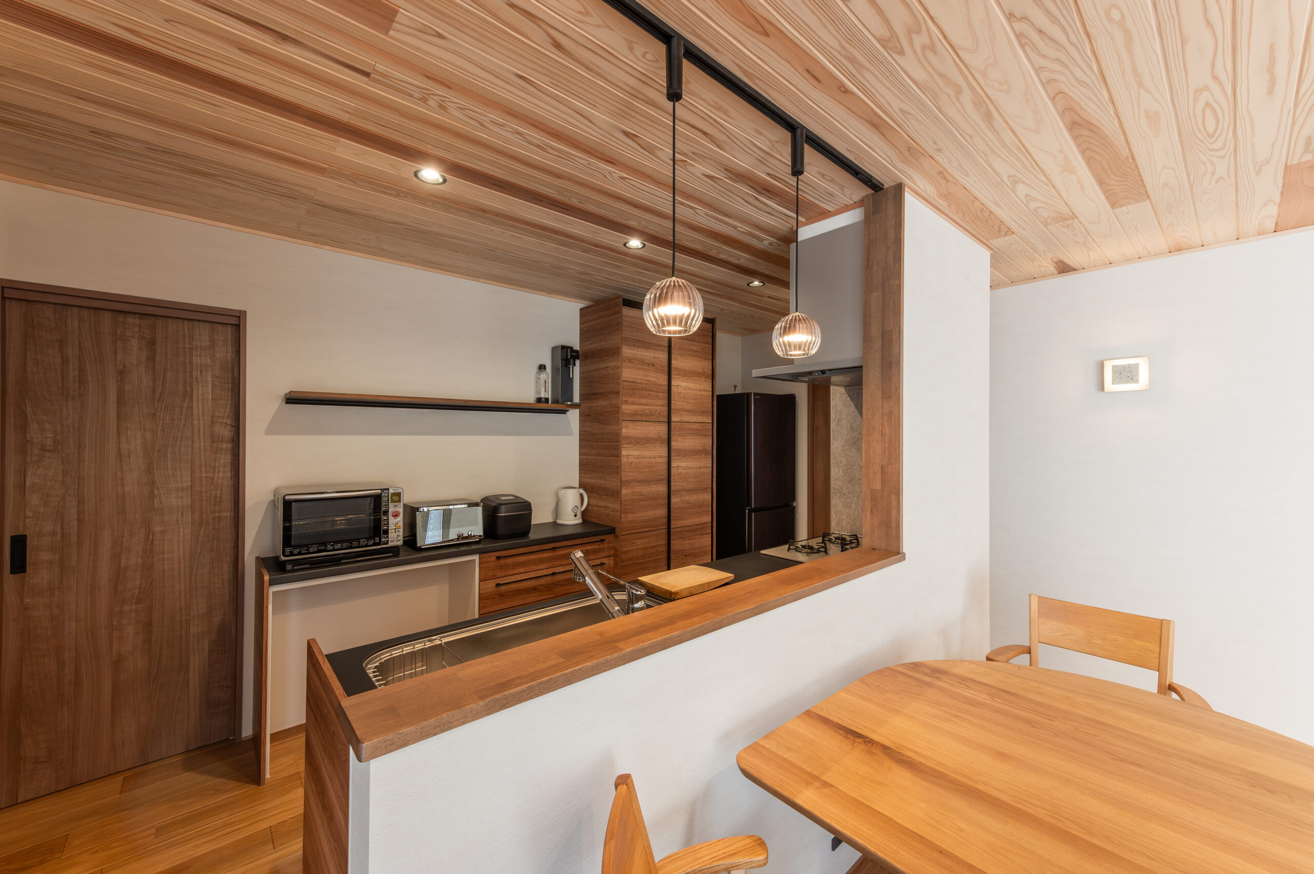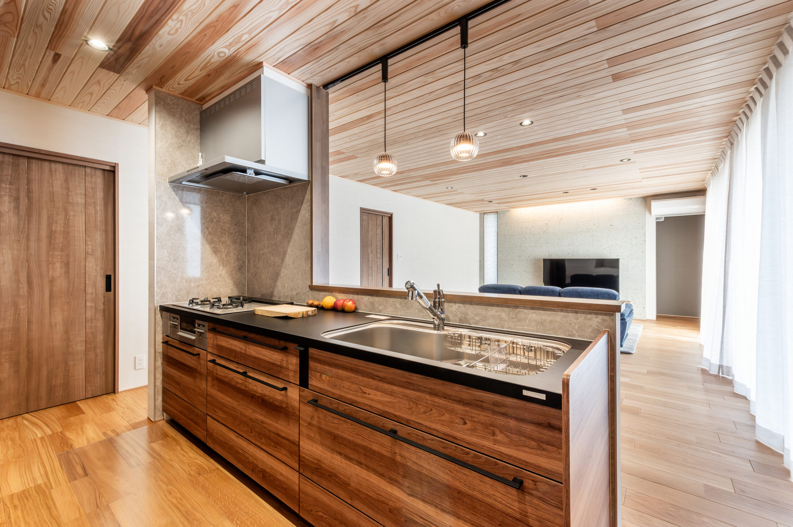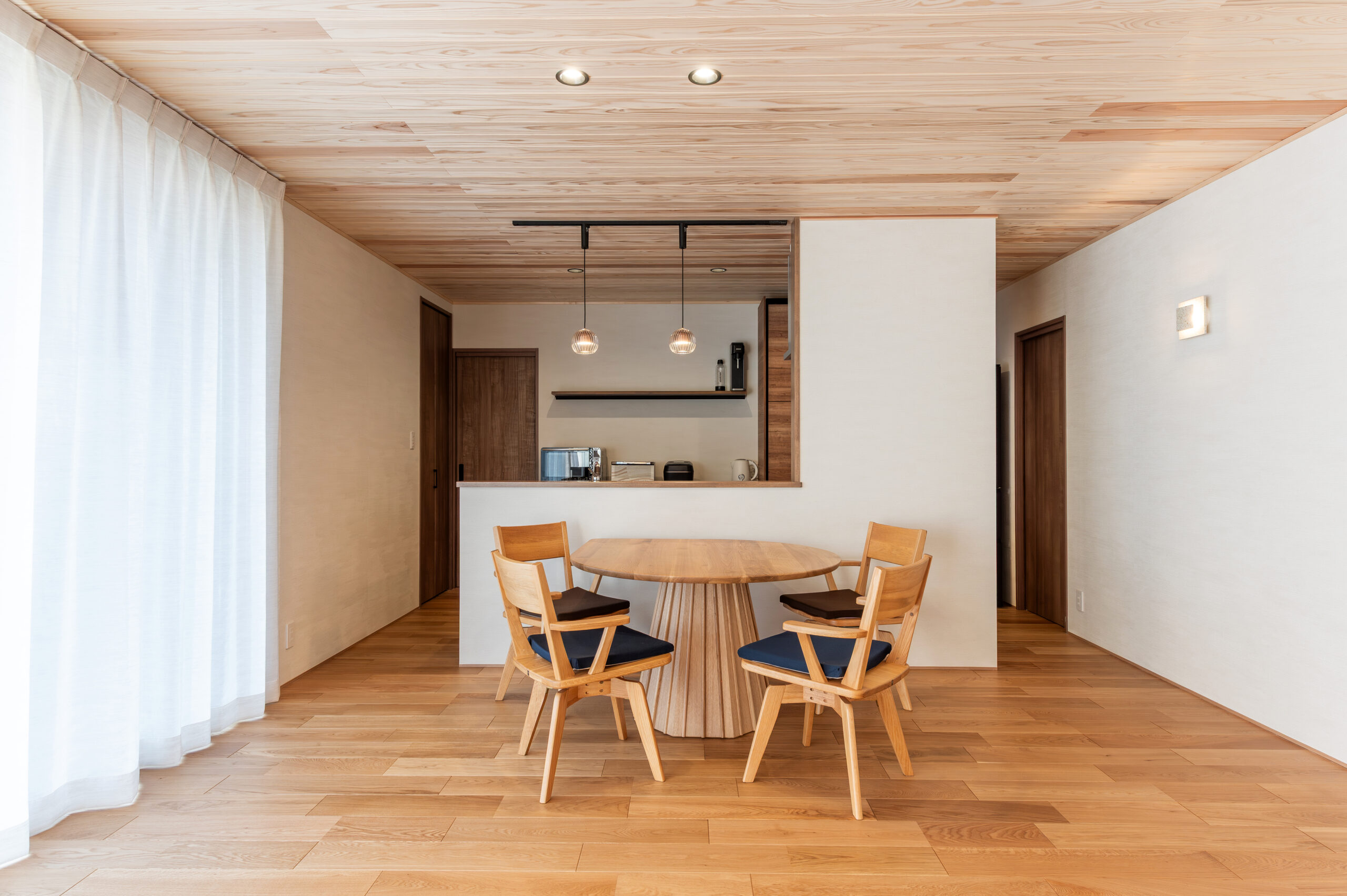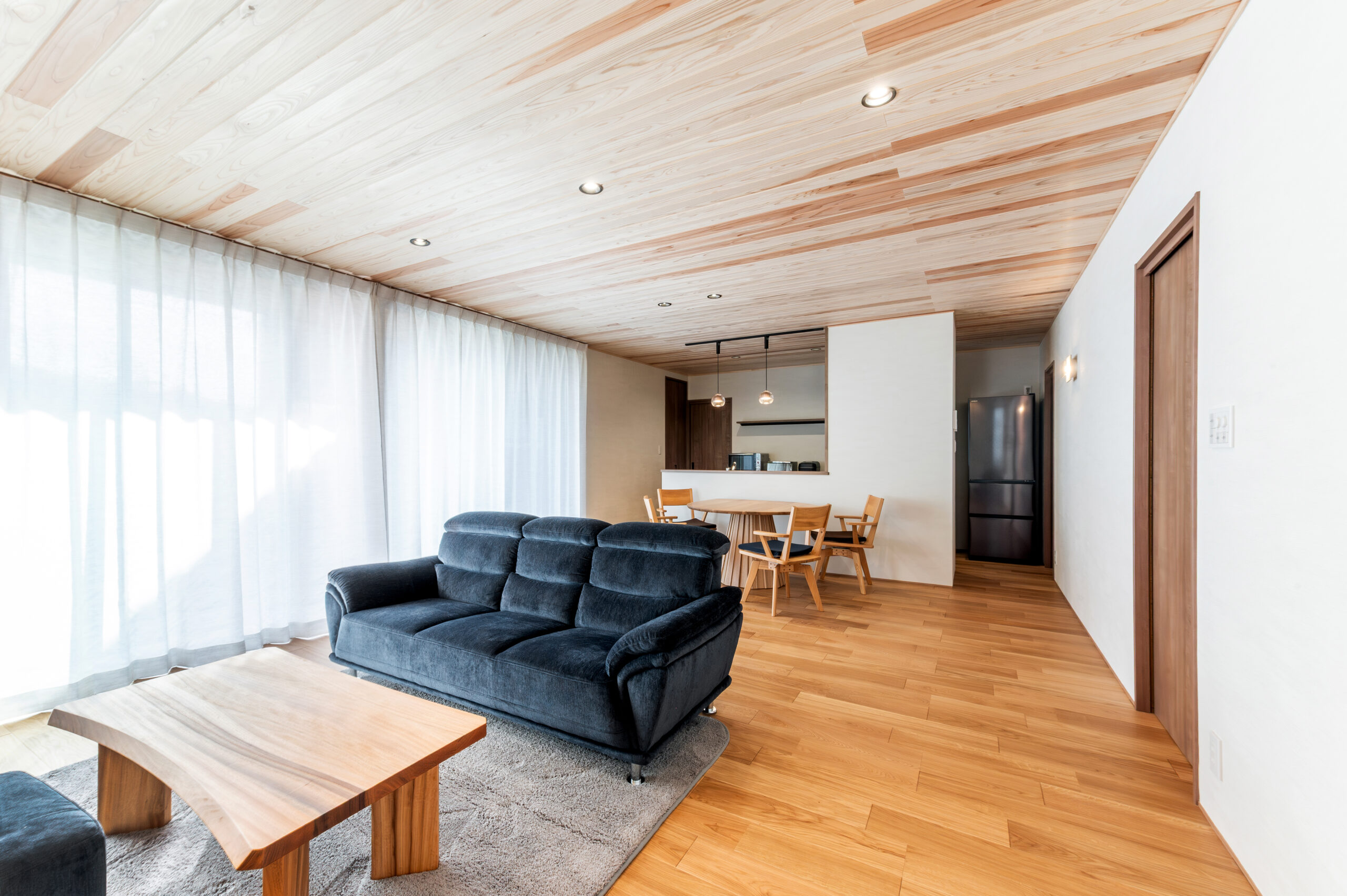 室内は、天井から床、キッチン収納まで美しい木目で統一され、どの空間にも柔らかなぬくもりが広がるデザイン。大開口サッシから差し込む光に包まれ、リビングとダイニングは明るく心地よい開放感に満ちています。外のウッドデッキと室内がゆるやかにつながり、自然を感じながら過ごす贅沢な時間が生まれます。