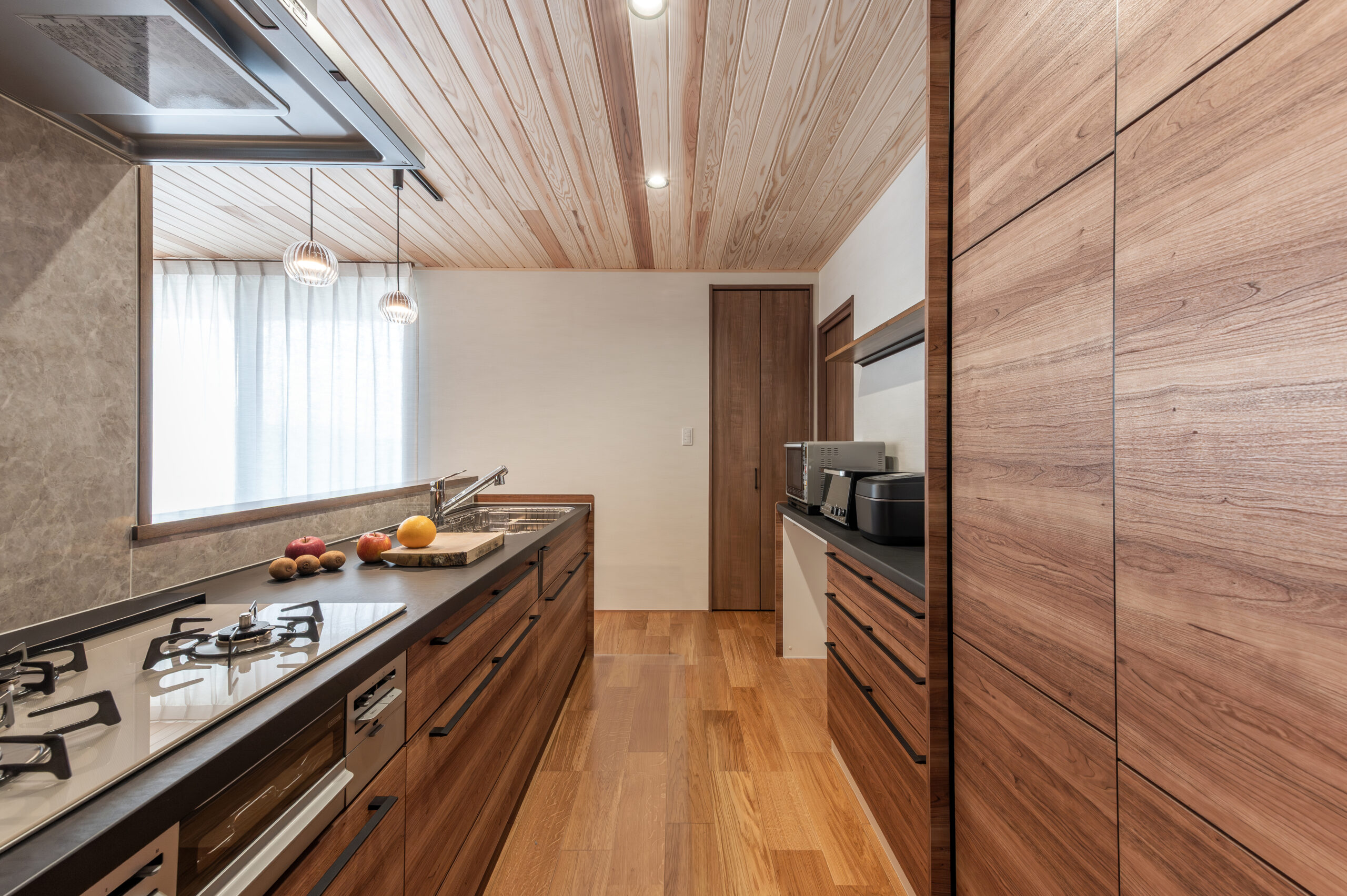 キッチンは木と黒を基調にしたスタイリッシュな造りで、回遊性の高い動線と収納力が魅力。ワークスペースも備え、在宅ワークにも最適です。