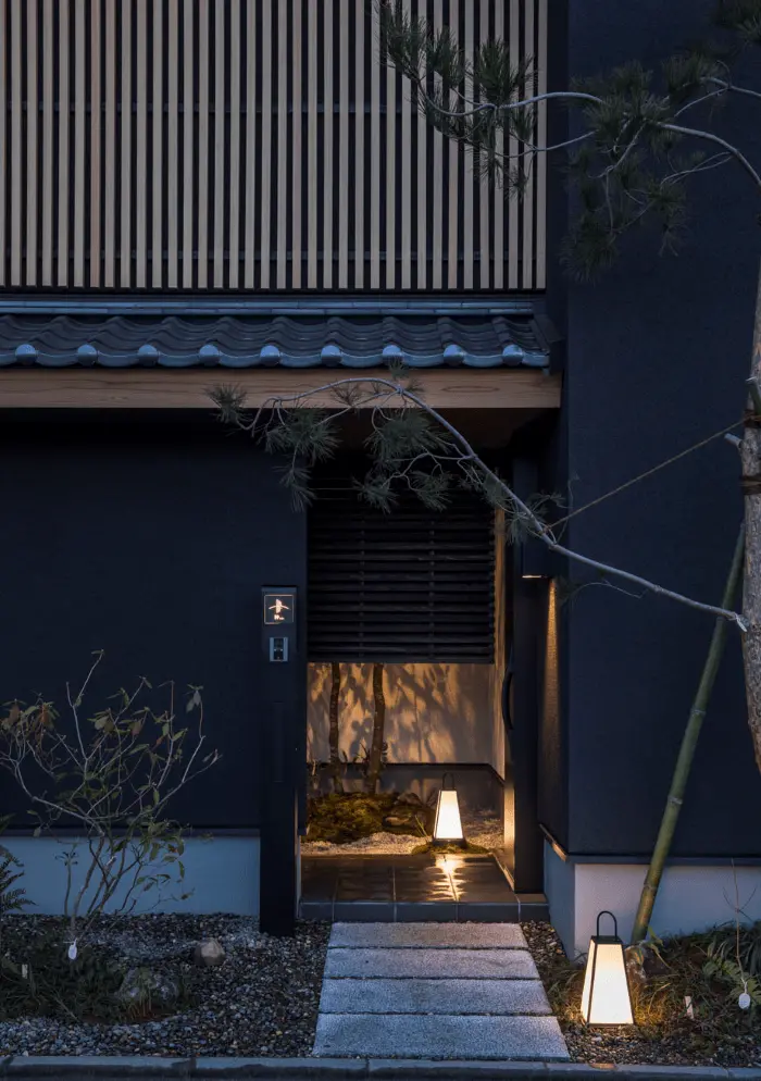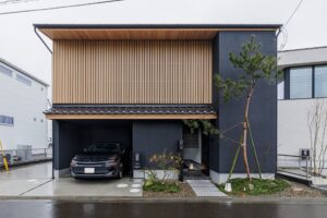 こちらは、木格子と黒い外壁が際立つ、和の趣とモダンなデザインを融合させた住宅です。