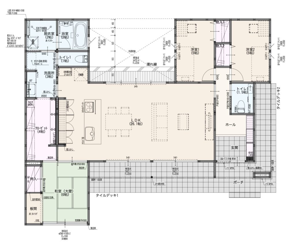 ご家族が自然と集まる広々としたLDKは和室とつながり、タイルデッキに面しているため開放感も抜群です。