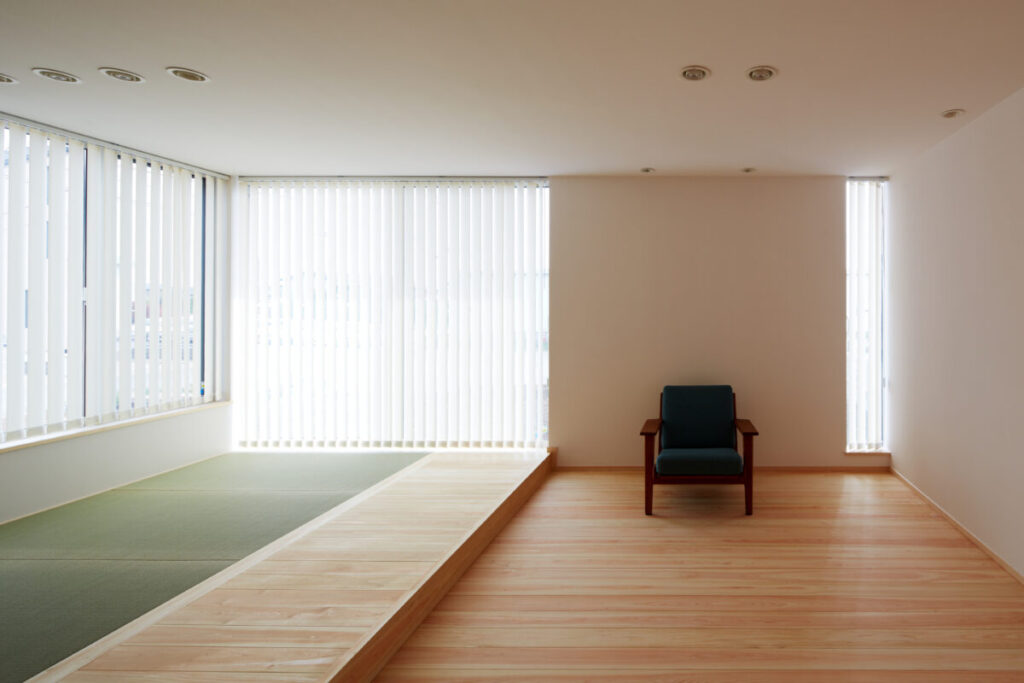 畳や小上がりといった伝統的な和の要素に、直線的なブラインドや明るい色味の壁紙を組み合わせることで、落ち着きの中に洗練された現代感を演出します。