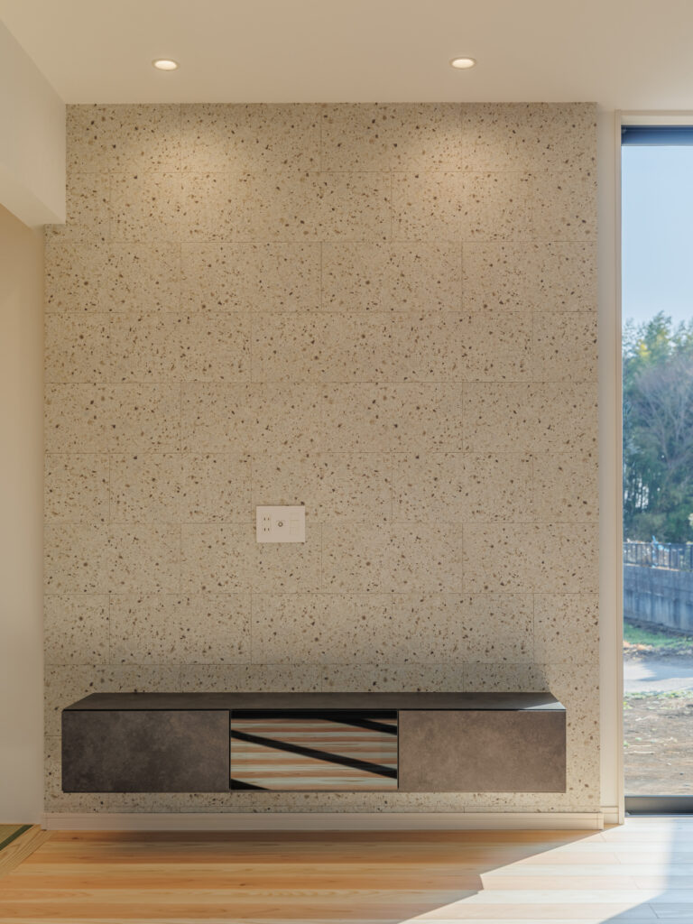 また、火山灰が固まってできた天然石「大谷石(おおやいし)」をアクセントに取り入れることで、調湿効果に加え、空間全体が上品に引き締まる印象を与えています。