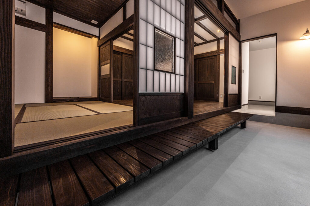 壁や天井には漆喰を用い、細部に至るまで古民家の意匠を丁寧に再現しています。