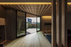 「通り土間」や「縁側」を思わせるウッドデッキなど、古民家の趣を現代的にアレンジしています。