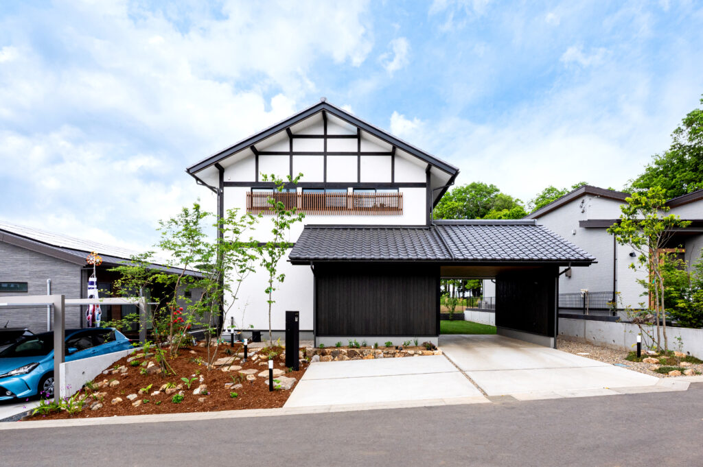こちらは、深い軒と和瓦屋根、白い外壁が上質な印象の古民家風住宅の外観です。