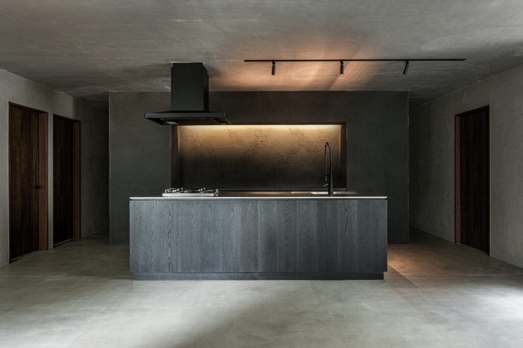 キッチンのデザインはシンプルながら洗練され、モルタル床と組み合わせることで、モダンで都会的な印象に仕上がっています。