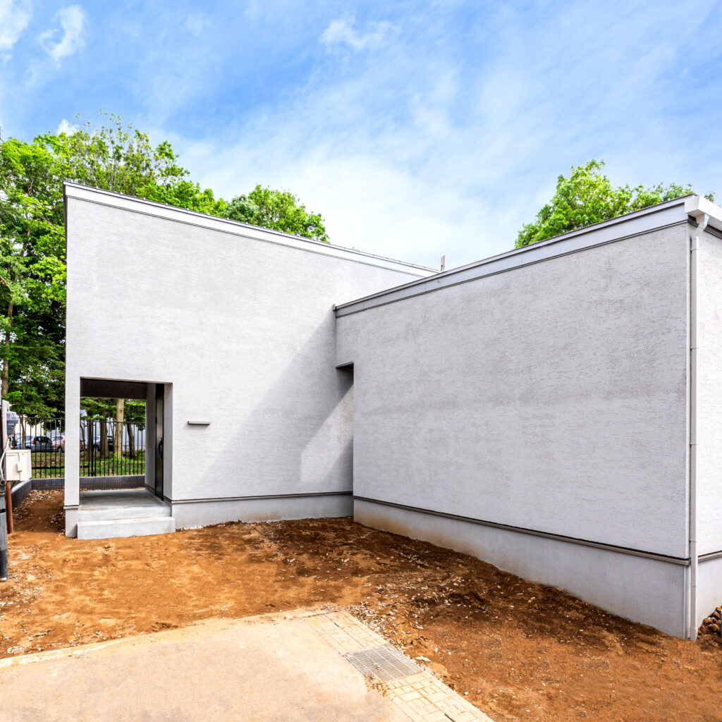 凹凸のないスタイリッシュなフォルムが印象的で、建築費用も抑えやすいデザインです。
